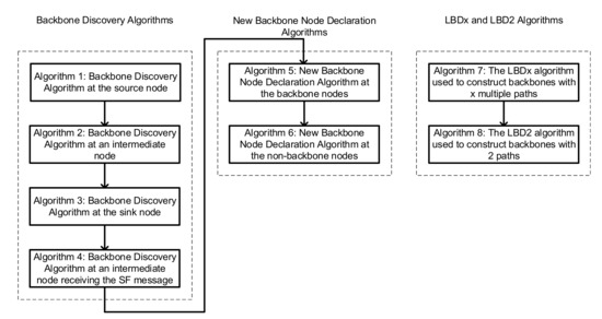 - Jawhar, I.; Wu, J.; Mohamed, N.; Zhang, S. An efficient graph search algorithm for backbone discovery in wireless linear sensor networks. In Proceedings of the 2015 IEEE 12th International Conference on Mobile Ad Hoc and Sensor Systems, Dallas, TX, USA, 22 October 2015; Institute of Electrical and Electronics Engineers (IEEE): San Diego, CA, USA, 2015; pp. 604–609. [Google Scholar]