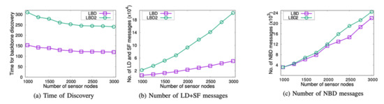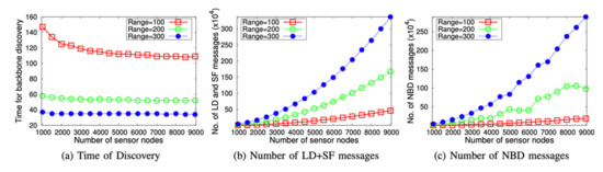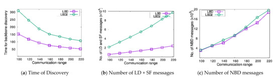 (1) LBD with Larger LSNs: The performance of LBD in large networks is presented in Figure 5. Figure 5a shows that the time for discovery of the backbone decreased when the number of sensor nodes (N) increased. In addition, the decrease rate decreased as N increased. This was due to the fact that the larger number of sensor nodes increasingly did not help to provide more connectivity. On the other hand, Figure 5b,c shows that the number of LD + SF and NBD messages increased as N increased. Furthermore, it can be seen that the increase rate increased, and N increased as well. This is reasonable since these messages were transmitted by the nodes in a broadcast manner, which was proportional to the square of the number of sensor nodes.