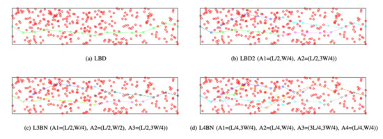 Visual examples of the discovered backbones for LBD, LBD2, LBD3, and LBD4, with L = 2500, W = 500, range = 200, and N = 300. (a) LBD (b) LBD2 (A1 = (L/2,W/4), A2 = (L/2,3W/4)) (c) LBN3 (A1 = (L/2,W/4), A2 = (L/2,W/2), A3 = (L/2,3W/4)) (d) LBN4 (A1 = (L/4,3W/4), A2 = (L/4,W/4), A3 = (3L/4,3W/4), A4 = (L/4,W/4)).
