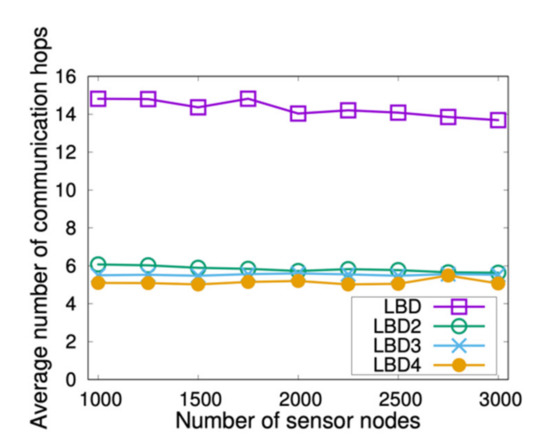 Comparison of the average number of hops for LBD, LBD2, LBD3, and LBD4 as the number of nodes increased.