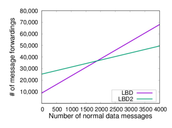 The number of message forwardings versus the number of normal data messages for LBD and LBD2.