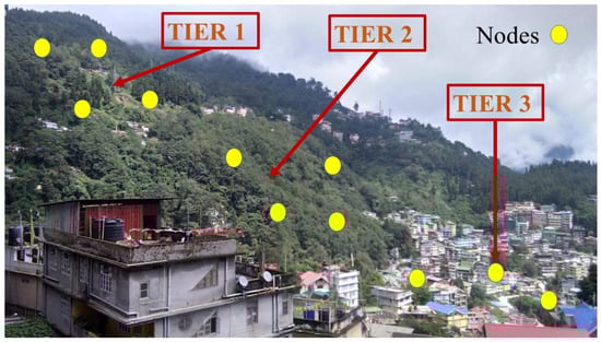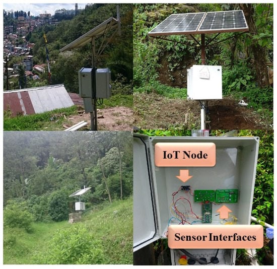 Figure 4 illustrates three nodes that are deployed at different tiers as mentioned in Figure 1. Each of the nodes in the field has four key components: (1) IoT module, (2) sensor interfacing circuit, (3) power harvesting system, and (4) sensors. The IoT module uses the wasp motes from Libelium, Inc. (libelium.com, Zaragoza, Spain) integrated with a tiny sim5300E modem. The reason for choosing this module is that it has many add-on industrial interfaces, such as RS485, Modbus, etc., and also has many sensors components off the shelf for future use. The IoT module has a processing speed of 16 MHz and 8 KB of RAM. The node has an ultra-low power consumption of 7 µA during hibernation, 30 µA during sleep, and 17 mA during the active state. The sim5300E modem connects the cellular network to the IoT node, and the sensor interfacing circuit helps the IoT node to communicate with sensors. The modem has both voice and data connection functionalities. In the node, sensor drivers use 4 KB of RAM in the controller; processing routines use 2 KB leaving only 2 KB for network routines. The sensors used are pore pressure sensors, movement sensors, and moisture sensors. The sensors are buried inside the soil to sense deep earth movements and characteristics. The power system uses solar energy to function the node. It harvests energy for operating during the nights and rainy conditions.
