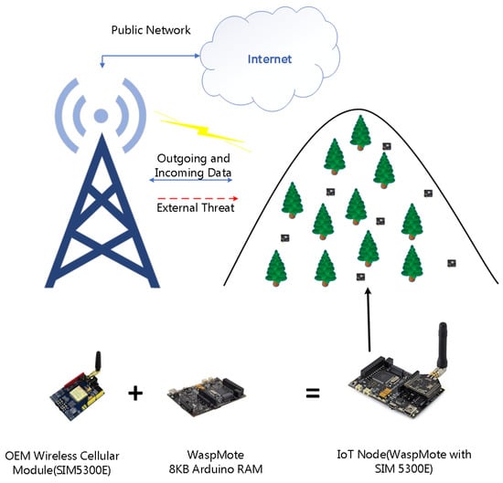 In this section, we mention the nodes in the deployment and their vulnerability to security attacks. The IoT nodes deployed in our scenario are directly connected to the cellular network, as shown in Figure 3. The IoT nodes have two main components: a sim5300E wireless cellular OEM (original equipment manufacturer) hardware module and a small controller (with only a few bytes of RAM). The wireless module connects the controller to the voice and data connection of cellular provider. This is the typical deployment scenario used in field implementations of IoT testbed without a proxy gateway.