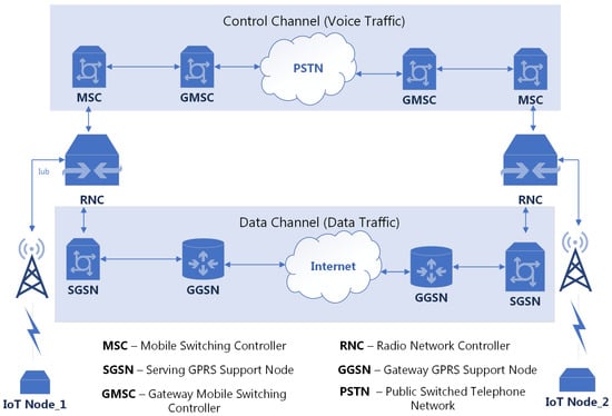 In this section, we elaborate on the design of VRITHI in terms of the control channel and the data channel. The reference diagram of the data flow using these two channels of the Telecom network is shown in Figure 5. It shows that the control channel and data channel take different paths to reach the peer IoT node. The control channel uses the voice traffic and Public Switched Telephone Network (PSTN) to reach the peer IoT node. Here, both the IoT nodes are connected using the International Mobile Subscriber Identity (IMSI) in PSTN, where the traditional DoS attack from botnets is not possible. However, the control channel has minimal bandwidth and could be used only for control parameters of data channel, such as changed IP addresses, the port for listening, duration of port open, etc. In contrast, the data channel is used for sensor data traffic that consumes bandwidth. During communications, both the control and data channel function simultaneously in an IoT node. Based on the parameters received in the control channel, the data channel is dynamically configured at run-time.