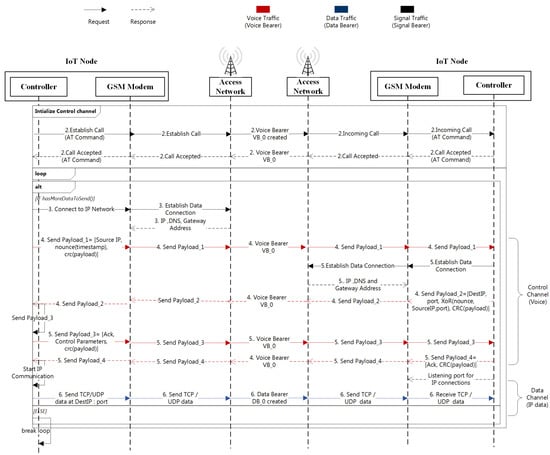 - Control Channel Initialization phase: The nodes enter this phase if they require to start collaborative real-time communication with other IoT nodes. In this phase, the UE uses the control channel to connect to other node, and a dedicated voice bearer VB_0 is created between the nodes by the Telecom network. The entire communication sequence between two IoT nodes is illustrated in Figure 6. The voice bearer is shaded in brown color, the data bearer in blue color, and the signal bearer in black color. In the figure, the control channel Initialization is shown as the message sequence (2).