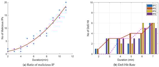 We retrieve from log details the time of attacks and different IP addresses from which attacks happened. We then plot the number of malicious IPs (the addresses that do not belong to our network) over a duration of 10 min, as illustrated in Figure 8a. The blue dots in the scatter plot represent the number of malicious IP addresses with three different test cases. The trend line (in red) reflects the rate at which the malicious IPs are targeting the node.
