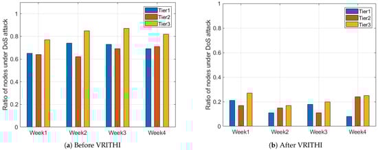 VRITHI leads to reduction of ratio of nodes under DoS attacks: (a) Before VRITHI, (b) After VRITHI.