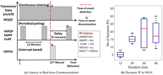 AMQP, XMPP, and CoAP are other prominent protocols that can act in either publish-subscribe or request-reply mechanism. Primarily, they use a Request-Reply mechanism. AMQP is mostly used in a business messaging scenario where mobile handsets communicate with the back-office data centers. It can work in both TCP or UDP connections but requires higher resource utilization compared to other protocols. It needs a third party broker, such as Rabbit Messaging Queuing (RabbitMQ), for inter-node communications. XMPP uses XML-based messaging predominantly over TCP connection. However, they additionally need a jabber-id and broker server, such as AMQP, for communications. CoAP uses less energy as compared to these protocols. However, it also needs a polling mechanism and third-party broker (CoAP Mongoose server) for functioning. In Figure 10a, the grey areas in AMQP, XMPP, CoAP indicate the period of polling for every 12 min. We can observe that, while an event is happening at the 15th minute, it is disseminated only after a delay of 9 min during the next polling. Moreover, periodical polling results in higher power consumption.