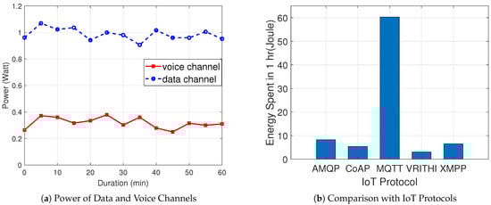 Energy consumptions using VRITHI. (a) Power of Data and Voice Channels, (b) Comparison with IoT Protocols.