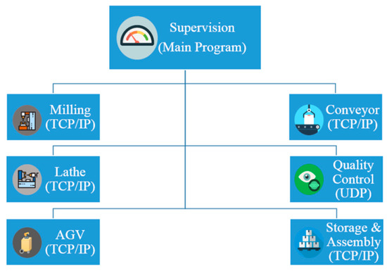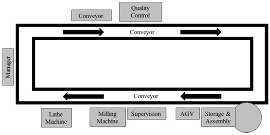 The existing manufacturing cell is composed by seven different stages: supervision, lathe machine, milling machine, conveyor, automated guided vehicle, quality control and storage/assembly. All the manufacturing cell stages are illustrated in Figure 2.