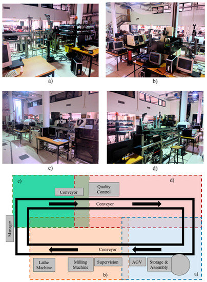 Hardware and the manufacturing machines of all the stages. (a) corresponds to the AGV and the Storage & Assembly stages; (b) corresponds to the Lathe and Milling machines as well as the Supervision center; (c) corresponds to a Conveyor segment; (d) corresponds to the quality control unit.