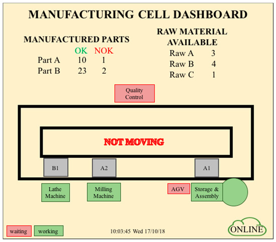 The supervision has the job to ensure the complete process of manufacture of the product and the communications between all the stages. Using several planning tools such as Gantt diagrams and State Machines, the production is planned. The communications protocols are selected to be adequate to every stage. Using TCP/IP and UDP the cell controllers communicate under the same Local Area Network (LAN). A main program assures the communication between all stages of the manufacturing cell. One dashboard is also created allowing the control and setup of all the machines from one single station. Using software services connected over the internet and supported in the Cloud, the manufacturing machines should show their status as well as the production stage of any product produced in the cell. An example of a manufacturing cell dashboard containing all the cell stages and the connection to the cloud is shown in Figure 5.