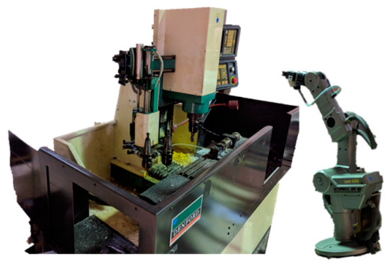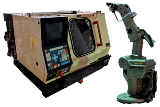 The lathe machine in the manufacturing cell is a Legacy Lathe, model Mirac, manufactured by Denford, Brighouse, West Yorkshire, UK. This Computer Numeric Control (CNC) machine understands the common G-Code, to control the different parts such as the spinner, the cutting tool, and the safety door. One robotic arm, model SCORBOT ER VII, manufactured by Eshed Robotec (now RoboGroup Education), Rosh Ha’Ayin, Israel, which grabs and manipulates the parts to be machined. The cell lathe machine and the robotic arm are shown in Figure 6.