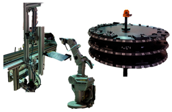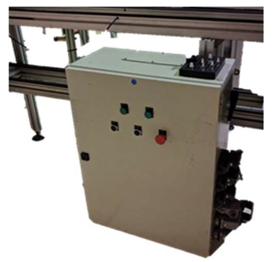 The cell has 3 major conveyor belts in two floors (two belts on the top floor and one in the bottom floor), 28 presence sensors and 6 flow blockers. Several WT2 Bosch platforms allow the products to flow through the workspace and two lifters exchange platforms between floors. All the sensors, motors, blockers and communication with a PC base station are controlled by a centralized automaton BOSCH (Robert Bosch GmbH,) equipped with the modules ZE200 and R200 (Gerlingen, Germany). The ZE200 module assures all the input/output connections with all the sensors and actuators controlled by the automaton. The R200 module registers all the dataflags and memory used by the program and establishes all the communications between the automaton and the cell network using LabVIEW (LabVIEW 2021). The cell ZE200 and R200 automatons modules are shown in Figure 8.