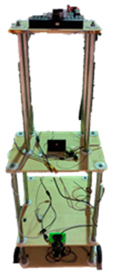 The cell has one motorized automated guided vehicle (AGV), which is a prototype built in the laboratory from other researches. It includes a small plastic robotic arm controlled by five servo motors connected to a microcontroller board. An infrared proximity sensor is used in the front of the vehicle to avoid collisions with the different stations of the cell. To control what is the present job and to give warning about the self-operation some RGB LED strips are used. Another separate microcontroller controls the proximity sensor and the LED strips. A webcam is used to follow a line in the cell floor, allowing the robot to move between stations. The network is very flexible being able to increase the number of available AGV’s. One computer running MATLAB interconnects everything and establishes the communication with the supervision station. The manufacturing cell AGV is shown in Figure 9 (model Torre, manufactured by IDMEC/Instituto Superior Técnico, Lisboa, Portugal).