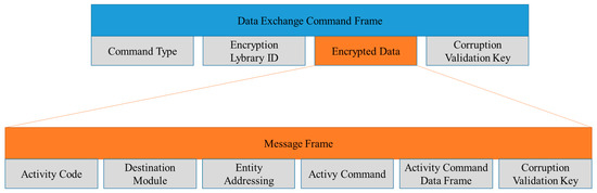 The corruption validation key is used to determine whether the message was changed during transmission. The corruption validation key is calculated using the frame data’s other fields, allowing you to check if the message has been modified. A message frame is included in the encrypted message data and is used for the activity itself. The activity code, destination module reference, entity addressing, activity command, activity data frame, and a corruption validation key are all included in the message frame.