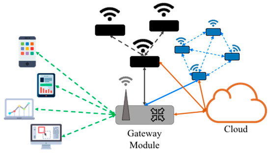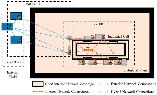 ZigBee [25,26,27,28,29,30,31,32,33,34,35] was the protocol chosen for the implementation using a mesh network topology. There are three different types of ZigBee module functionality: coordinator, router, and end device. The coordinator manages the network. The router relais messages from other nodes. The end device is connected to sensors and actuators and can be asleep to save the device consumption energy. A fully functional wireless network, with interior (LevelID = 0), exterior (LevelID = 2) and hybrid connection (LevelID = 1) networks is shown in Figure 16.