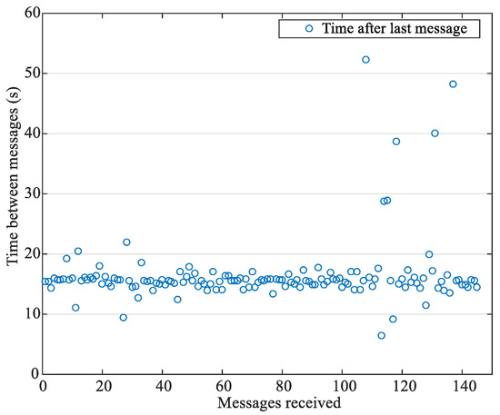 The microcontroller generates an index number and a timer and sent these two values to the ThingSpeak platform in loop. Exporting the acquired online data and processing it using MATLAB, the time difference between the received messages is shown in Figure 17.