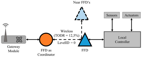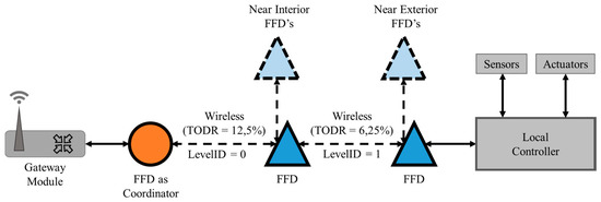 A parameter to be considered when using communications in a multi-level architecture is the Time Occupation Duty Ratio (TODR) that indicates the time period which communication driver can take to transmit data to the FFD coordinator [37]. The final TODR value depends on the quantity of ZigBee levels, q, within the network and it’s given by: