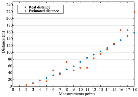 For better explanation of the results obtained, a plot was made containing the real distance of the measurements and the estimation using (7) is shown in Figure 21.