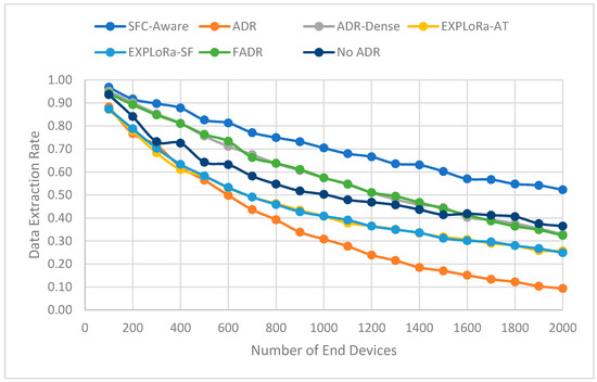DER is the ratio of traffic sent by end devices to the traffic received by the gateway. The value ranges from 0 to 1 and the closer the value is to 1, the better the DER. At 100 end devices in the network, the results obtained for the proposed algorithm are closely matched with those of the other algorithms presented in Section 2.2. At this point, the proposed algorithm’s performance displays a slight superiority over the rest of the algorithms, achieving a DER of 0.97, a value that is 0.02 units higher than that of the closest competition from ADR-Dense. Overall, the performance relationship displayed by the results is an inverse proportionality relationship. The performance of the proposed algorithm starts high when the network size is small and exponentially degrades as the network size increases. Throughout all network sizes, the proposed algorithm has shown superior performance over the rest of the other algorithms including the native ADR and network with no ADR. As the network size continues to increase, the performance of the proposed algorithm starts to pull away from the rest, degrading less and less compared to the rest of the algorithm. ADR-Dense and FADR, which are the closest competitors to the proposed algorithm, begin to achieve DER results below 0.5 at about 1200 end devices. At this point, the proposed algorithm still achieved an ADR value of over 0.6. What is significant from the results presented in Figure 2 is that throughout all the network sizes studied, the proposed algorithm managed to achieve a DER of over 0.5. At the maximum number of end devices, the DER achieved by the proposed algorithm stands at about 0.52. Surprisingly, the closest result to this is that of a network with no ADR algorithm employed and is at 0.36. That means at 2000 end devices, the proposed algorithm achieves a 44% better performance over its closest competitor. Overall, the proposed algorithm has shown superior performance over the discussed algorithms in Section 2.2, the ADR and the network with no ADR.