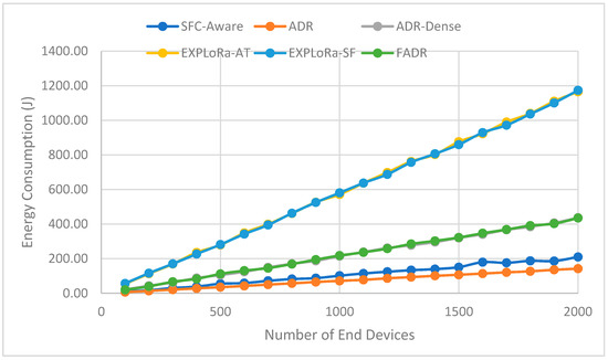 Even though the native ADR outperformed all the algorithms it was compared with, the proposed algorithm still managed to achieve reasonable EC performances closest to those of the native ADR. For small network sizes, the EC performance differences between the proposed algorithm and the native ADR were barely noticeable. From the experimental results, it is evident that the performance differences become most noticeable at 2000 end devices in the network. At this network size, the proposed algorithm consumed 70 joules more energy than the native ADR. The extra energy consumption by the proposed algorithm was to be expected as, in addition to computing optimized data rates for end devices, it also must go a step further and ensure that the data rates provide the end devices’ traffic with optimized collision probabilities. Therefore, considering this reason, it can be argued that the proposed algorithm performed desirably. Especially because the algorithm was only built to improve DER.