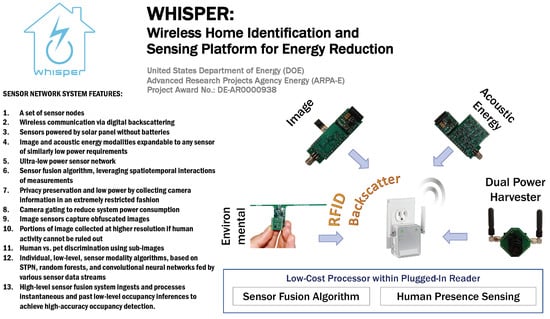 The WHISPER system is designed as a next-generation occupancy sensing platform for smart homes, systems, and electric system infrastructure. Occupancy presence detection for smart home control promotes high renewable penetration, grid decarbonization, and associated smart grid applications. Monitoring the human occupancy status supports the growing emphasis on indoor environmental quality (IEQ) and health-in-building applications, while activity-based analytics will enable smart systems at large. WHISPER targets high accuracy as well as low false alarm rates regarding both false negatives (falsely assuming vacancy) and false positives (falsely assuming occupancy), while distinguishing between pets and humans. Its design focus is to achieve substantial energy savings while maintaining wide user acceptance by the purposeful obfuscation of personal information: the system is locally wireless so users can avoid cloud-based approaches and ensure privacy preservation. The WHISPER platform’s hardware and software components, including the hierarchical sensor fusion algorithm, are detailed herein.