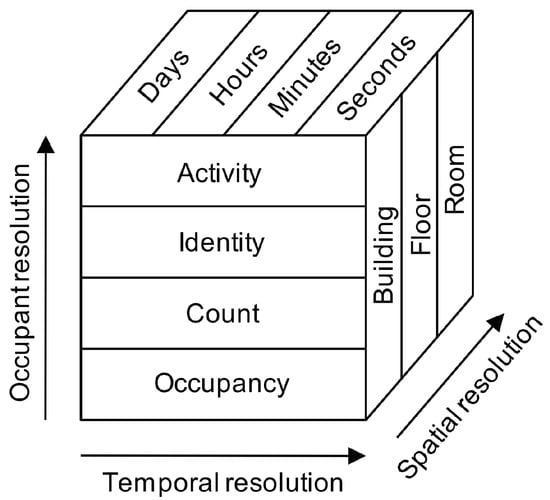Representation of different occupancy detection resolution levels across three different dimensions (occupant, temporal, and spatial); from Melfi et al. [22]. Reprinted with permission.