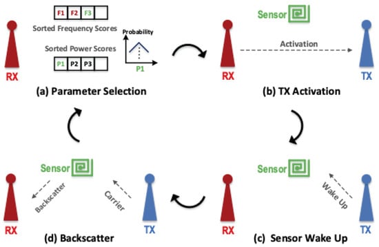 First, a closed-loop tuning system selects the communication parameters (e.g., frequency and TX carrier power) to maximize the backscatter link’s throughput. The propagation loss of wireless signals is frequency dependent. Therefore, the backscatter and TX interference, which operate at separate frequency bands, experience different attenuation levels while propagating toward the RX. Since the backscatter signal carries the data and the TX signal is an interferer, the optimal frequencies for backscatter communications are those with the minimum loss for the backscatter signal and maximum loss for the TX interference. The WHISPER’s closed-loop operation is depicted in Figure 3. The RX unit uses the result of the previous communication attempts to select the best frequency and power level for the carrier signal (Figure 3a). Next, it sends this information to the TX unit, along with the sensor node ID and the command for the sensor node (Figure 3b). Once the TX unit receives the information, it first generates a waveform to wake up the specific sensor node and transfer the command (Figure 3c) and then sends out the carrier signal for backscatter communication. The sensor nodes are in idle mode until the TX unit activates them. Once activated, they respond to the command by sending out one or more backscatter packets (Figure 3d) [75,76].