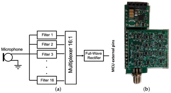 Block diagram of the acoustic energy sensor (a). An acoustic energy sensor daughter board (bottom) and a harvester board (top) are mounted on a basic sensor node board (b).