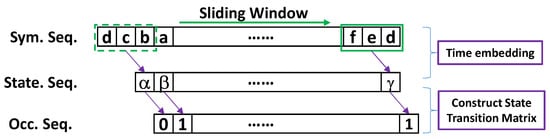 Time embedding performed on symbol sequence, with sliding window size (depth) of 3 to generate the state sequence, and to construct state transition matrix by capturing the transition between state sequence and occupancy sequence.