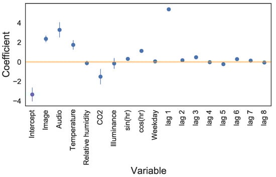 where is the vector of exogenous modality coefficients, is the vector of exogenous time-related coefficients, and the autoregressive terms, corresponding to coefficients on the past occupancy predictions, are given by . The vector represents historical occupancy predictions, while is a vector representing the probabilities of occupancy given the instantaneous modalities, and is a vector of containing information on time of day and day of the week. The final form of the equation is given by Equation (4).