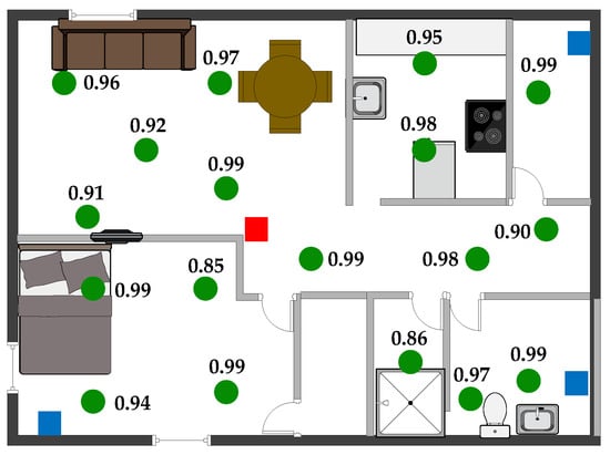 Further extending the coverage of a backscatter system is possible by using multiple RX and TX base units to form a larger network. Each RX–TX pair can communicate with each sensor node once the node is in its vicinity. The network coverage is first extended by adding more TX units. This solution is suitable for multi-bedroom apartments up to 100 square meters. The data transfer occurs between the RX units and sensor nodes, and TX units are support devices that relay the command to sensor nodes and generate the carrier signal to facilitate the backscatter operation. Adding more TX units, therefore, does not change the system architecture. The RX unit decides which TX unit has the best performance in communicating with each sensor node. Using multiple RX units allows the further extension of the backscatter coverage such that it can cover multi-level residences [76].