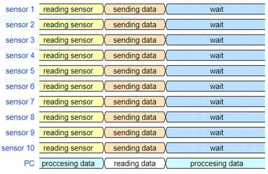 Figure 4 shows a timing diagram of all sensors, together with the host computer, during the data exchange. Every sensor controller reads data from the pressure matrix as described previously, and then sends that data immediately via a serial connection emulator. There are ten virtual connections, and the host computer receives data randomly and processes it according to the ID tag. After sending the data, the sensor controllers wait for the next cycle to start. All ten sensors can start sending data at any time, i.e., whenever the data is ready. When the first data set exchange has finished, the second sensor controller starts sending data, which is not always in order.