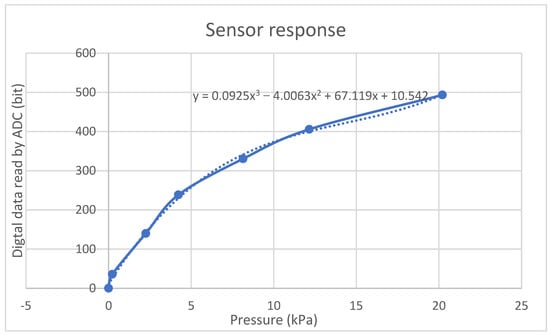 To determine the sensor output characteristics, we applied a pressure of 0.2 kPa, 2 kPa, 4 kPa, 8 kPa, 12 kPa, and 20 kPa to the sensors. Figure 5 shows the output characteristic of the pressure sensor. From the output characteristics, we can then get the equation. When measuring the sensors one by one, each one has a slight difference in terms of its output because of a minor difference in sensor thickness; as such, the gain needs to be adjusted. Every point of the piezoresistive sensor varies within the sheet. Therefore, it is necessary to calibrate each sensor to obtain a consistent weight value. Sensors were calibrated using a 500 g weight. The gain and offset were then calculated using standard span and zero adjustments. The sensor output characteristic gradually decreased in value as it approached the maximum pressure.