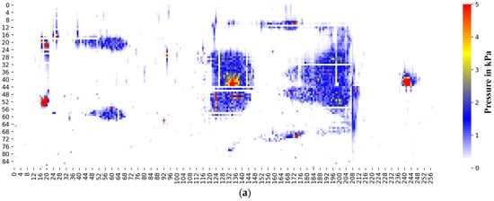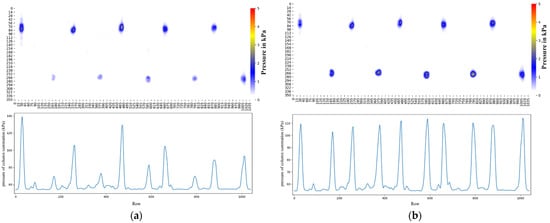 This gain adjustment was performed by multiplying the resistance with a 500 g weight so that when the same load was applied to each sensor, the pressure value would be the same. Figure 6a shows a poor quality of the 10-point heatmap before the calibration process. Figure 6b shows the same points after calibration with the same heatmap display, and which demonstrates improved consistency. The numerical values of the data after calibration also show consistency, as displayed at the bottom of the picture.