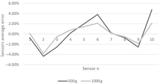 We undertook a trial test with a 1000 g load to show the effectiveness of the calibration process. Ten adjacent sensors were tested with the same load. Figure 7 shows the outputs of the ten sensors measuring the 500 g and 1000 g weight. As shown, the maximum deviation was 4%, as indicated by Sensor 2. Other sensors showed a variation of less than 2%, as indicated by the light gray line. The dark gray line shows the deviation, i.e., about 4%, when the piezoresistive sensors measured a 500 g weight.