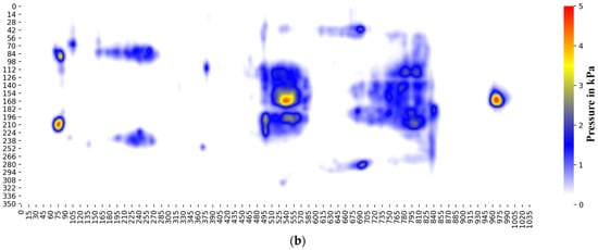 The heatmap upscaling process involves through several stages. The first is to threshold the data starting from 0.5 kPa, because when sensors are under no pressure, the result indicates 0–0.5 kPa. Inconsistencies could result from spurious noise from the sensor itself and some simple movement of the person laying on the sensor sheets. The second step was Gaussian filtering to reduce high-level noise by averaging neighboring data. The Gaussian filtering process is widely used to smooth data in image processing [17]. We used a Gaussian filter because distribution was centered around the zero frequency with positive and negative frequencies at both sides. With Keras, the data was easier to investigate. Figure 8a shows the raw image data before processing. In this image, several red areas had high-pressure values and were difficult to differentiate the adjacent values. Figure 8b shows the image after upscaling and smoothing using Keras and Gaussian filters. This figure shows the smoothing effect markedly, as compared to the previous image.
