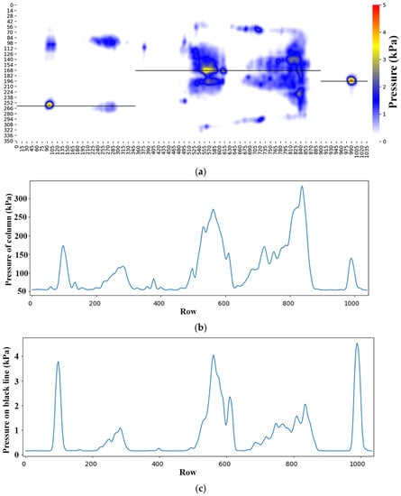 Pressure distribution comparison of a person lying down: (a) Pressure area; (b) Summation of column; (c) Pressure value in the black line.