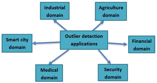 Outlier detection in IoTs and networks is widely used in a variety of real-world applications, as shown in Figure 1. For example, the Internet of Medical Things (IoMT) [] is used widely in the healthcare domain. It monitors patients’ health continuously and gives remote assistance and alarms in time of any modifications in defined conditions []. Furthermore, in the industrial domain, sensors are built into machines to monitor resource management, as well as there being many variables, such as temperature, humidity, and pressure to detect events and trigger suitable alarms []. Another example is the Manufacturing Internet of Things (MIoT) [] for analysing industrial big data in real-time. Moreover, in the agriculture domain, sensors are deployed in a harsh environment to monitor and collect many variables like temperature and humidity in real-time []. In the security domain, the outliers or abnormal values may be an attack that would threaten the network security []. In smart city applications, outlier detection techniques can be used in many situations, like monitoring water quality. It provides real-time information and warnings to control water pollution []. In the financial domain, it is crucial to monitor the audit logs for the financial transactions stored in a database, then to report and verify the abnormal behaviour detected in data [].