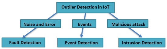 There are three sources of an outlier in data collected in IoT and therefore three corresponding outlier detection techniques []. These sources are error and noise, events, and malicious attack, as summarized in Figure 2 and described below: