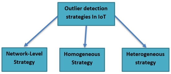 - Heterogeneous strategy: the aim here is to group different sensors to detect the sensor’s failure by classifying the sensors data values output. The Outlier Detection Module (ODM) proposed in [] is an example of a heterogeneous strategy in IoTs, where the heterogeneous sensors are connected to this module and to a microcontroller, and they send their sensed data values to both. The microcontroller will monitor the data received from the sensors while running the multi-agent deep reinforcement learning-based and distributed outlier detection on the module to identify the outliers.