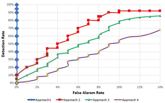 Outlier detection for IoT aims to detect outliers and differentiate with high detection rate (DR) and low false alarm rate (FAR) between errors and events. The efficient outlier detection technique must respect the IoT resource constraint devices, such as the computational cost, memory usage, and communication overhead. The DR is the percentage of abnormal data values that are considered as outliers correctly. The FAR is the percentage of normal data values that are considered as outliers incorrectly. Another way to measure the efficiency of an outlier detection technique is to use the receiver operating characteristic (ROC) curve [,,], which is a two-dimensional graph that represents the trade-off between the DR and the FAR. Figure 5 shows a generic illustration of how to interpret this curve by different fictional approaches. The efficient technique is the one that has high detection rate and low false alarm rate with a large area under the curve (AUC). From Figure 5, we can say that approach 1 (ideal approach) realizes the best performance compared to other ones.