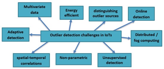 Developing an effective outlier detection technique is more difficult due to the IoT context and the sensor data nature. The IoT ecosystem encompasses the traditional WSN, which allows more analysis and processing of the collected data []. However, as shown in Figure 6, there are numerous challenges encountered while designing an outlier detection system for IoT.