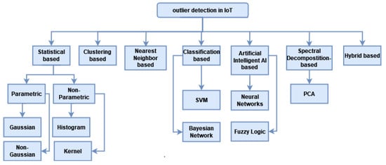 The IoT can be seen as a collection of technologies that work together and provide Internet-based services and applications. With the aid of electronic devices connected to physical objects, heterogeneous sensors can collect data for process control []. The IoT involves many resource-constrained nodes that are deployed to sense, collect, and transfer data to a base station or a data center. In such a way, the appropriate decision can be taken in a controlled environment. IoT is utilized in various sectors, including environment monitoring, medical, agriculture, disaster warning, smart city, and manufacturing. However, the collected data in the real world are vulnerable to outliers, which are data samples that are considerably different from normal data. In IoT, an outlier may occur due to inherent characteristics of the sensor device itself, or because of the harsh environment where the nodes are deployed. Data quality could be affected by a sensor failure, noise, malfunction, missing or duplicated data values, etc. These outliers can also concern the exchanged network information relative to the network operation (i.e., sending and receiving messages). So, it is essential to detect these outliers before any in-network processing, like fusion or aggregated data, to limit the propagation of these incorrect data and conserve the collected data’s effectiveness to perform a suitable decision. To ensure network QoS, the IoTs must detect the outliers and take the necessary action to eliminate the degradation of the service. Moreover, IoT comes with the aspect of a high number of heterogeneous embedded devices that generate big data, which makes the outlier detection more complex against such massive data []. Furthermore, with the significant advancements in artificial intelligence (AI) techniques, anomaly tracking has also addressed a new trend in data collection and maintaining a high degree of confidentiality for the transmitted data. The power of the AI will have additional resources to protect vulnerable networks and data from faulty components. Subsequently, AI can then analyse network activities effectively, deduce a pattern, and identify all sorts of deviations or irregularities in its collected data. With such an approach, it is much easier to identify network anomalies quickly.
