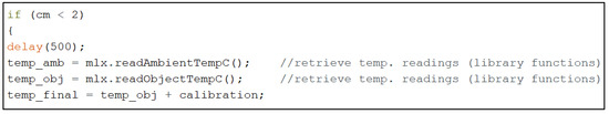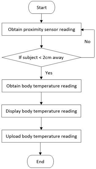 When the proximity sensor detects the subject’s forehead at a maximum distance of 2 cm away, the temperature sensor is triggered, and the subject’s body temperature is measured. A time lapse of 5 s between proximity sensor detection and temperature sensor activation is included to provide leeway for subjects to place their forehead, ideally in front of the sensor for accurate body temperature measurement. Two types of sensors are typically utilised for body temperature measurements—namely, a thermal vision camera or a non-contact infrared (IR) thermometer. An MLX90614 IR non-contact thermometer was preferred for this application to keep development costs to a minimum.