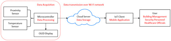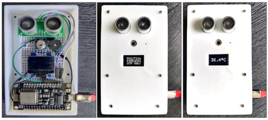 As shown in Figure 3, the information captured by the sensors is processed by a microcontroller. In addition to displaying the sensor readings via a 0.96-inch, 128 × 64 resolution Organic Light-Emitting Diode (OLED) display, the microcontroller also provides alerts in the form of a beeping buzzer when an individual with an elevated body temperature or fever above 37.5 °C is detected. Based on these alerts, building management or security personnel can take follow-up action such as barring the individual from entering the premises.