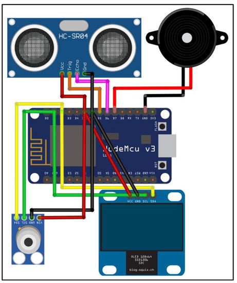 The HC-SR04 is a digital ultrasonic sensor, and the connection is straightforward, with the TRIGGER and ECHO pins connected to pins D5 and D6, respectively. Based on Figure 4, both the MLX90614 non-contact temperature sensor and the OLED display communicate with the microcontroller via the I2C protocol, which is a simple, bidirectional synchronous serial bus. I2C requires only two wires—a serial clock line (SCL) for synchronising transmission and a serial data (SDA) line through which bits of data are sent or received—to transmit information between devices connected to the bus.