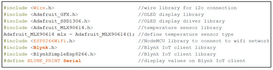 Next, the Arduino IDE programming interface was utilised to develop and upload the custom code—necessary to capture body temperature data via sensors and broadcast the information to the cloud—to the NodeMCU microcontroller. Based on Figure 7, the initial step in programming the script to obtain body temperature information was to install and include the applicable libraries—namely, the Wire library for the I2C connection, the OLED display library, the MLX90614 library, and the Blynk library. The Wi-Fi SSID and password for connection to the wireless network was added, along with the custom Blynk authorisation key to upload data to the cloud server.