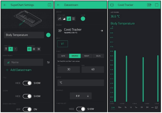The script for capturing distance values was added, while the body temperature readings are retrieved via library functions, as shown in Figure 8. This data is then uploaded to the Blynk IoT client. Next, the script to display temperature values via the OLED display was added along with the high-temperature warning script for the buzzer. Lastly, the Blynk IoT client application widgets were configured to display relevant information to users, as presented in Figure 9.